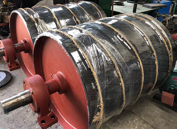 传动滚筒是输送机传递动力的部件。传动滚筒表面有裸露光钢面,人字形和菱形花纹橡胶覆面。小功率、小带宽及环境干燥时可采用裸露光钢面。人字形花纹胶面摩擦系数大,防滑性和排水性好,但有方向性。菱形胶面用于双向运行的输送机。